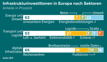 • Infrastruktur-Investments (u. a. erneuerbare Energien mit Solarparks, Windrädern oder Stromtrassen) sind mit zehn bis zu 50 Jahren oft sehr langfristig ausgelegt und sollen sechs bis sieben Prozent p. a. bringen.